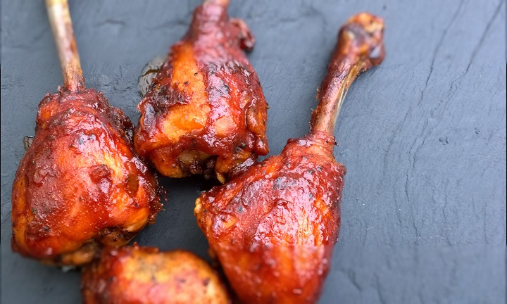 Den Kugelgrill für indirektes Grillen einrichten und bei geschlossenem Deckel auf 230°C einregeln. Die Alugrillschale mit den Lollipops, sowie den restlichen Hühnchenteilen versetzt zu den Grillbrikets auf den Grillrost stellen und bei geschlossenem Deckel 40-50 Minuten grillen, dabei hin und wieder wenden und mit der Glasur einpinseln.