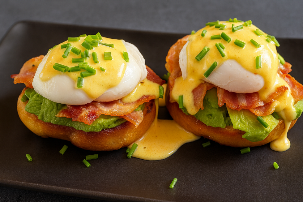 Nun die Toastscheiben toasten und mit dem ausgelassenen Speckfett bepinseln. Toasthälften mit Avocado,Früstücksspeck und den pochierten Eiern belegen. Sauce Hollandaise darübergeben mit Schnittlauch und grobem Pfeffer bestreuen und sofort servieren.
