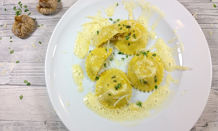 In einem Topf ausreichend Salzwasser zum Kochen bringen und die Ravioli für einige Minuten darin gar ziehen lassen. Inzwischen in einer Pfanne die restliche Butter zerlassen. Die fertigen Ravioli mittels einer Schaumkelle herausheben abtropfen lassen und kurz in der heißen Butter schwenken.