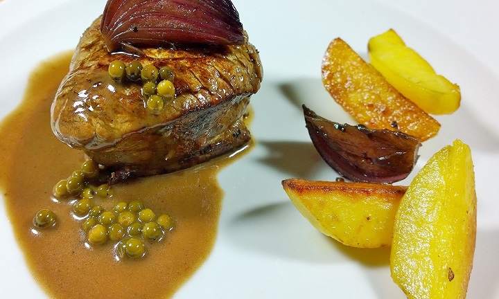 Die Steaks auf vorgewärmten Tellern mit der Sauce anrichten. Mit den grünen Pfefferkörnern sowie den beiseitegelegten Zwiebelspalten aus der Sauce garnieren und mit gebratenen Kartoffelecken servieren.