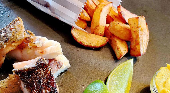 Nun stapelt man die Fischfilets übereinander, reicht dazu die Limettenspalten, sowie die Mayonnaise und die Pommes in einer Papiertüte – ein Fastfood-Klassiker neu inszeniert.
