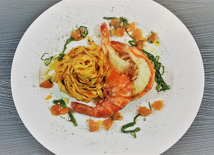 Die Tomatennudeln auf vorgewärmte Teller geben und die Garnelen darauf anrichten, die Zucchinizesten darum herum verteilen und mit Pesto garnieren.