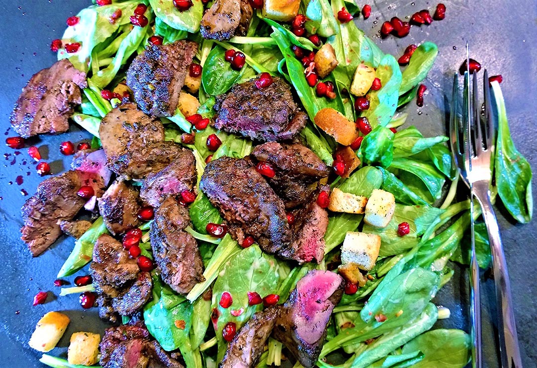 Hähnchenleber auf Rapunzelsalat mit Speck-Croutons und Kartoffel-Dressing