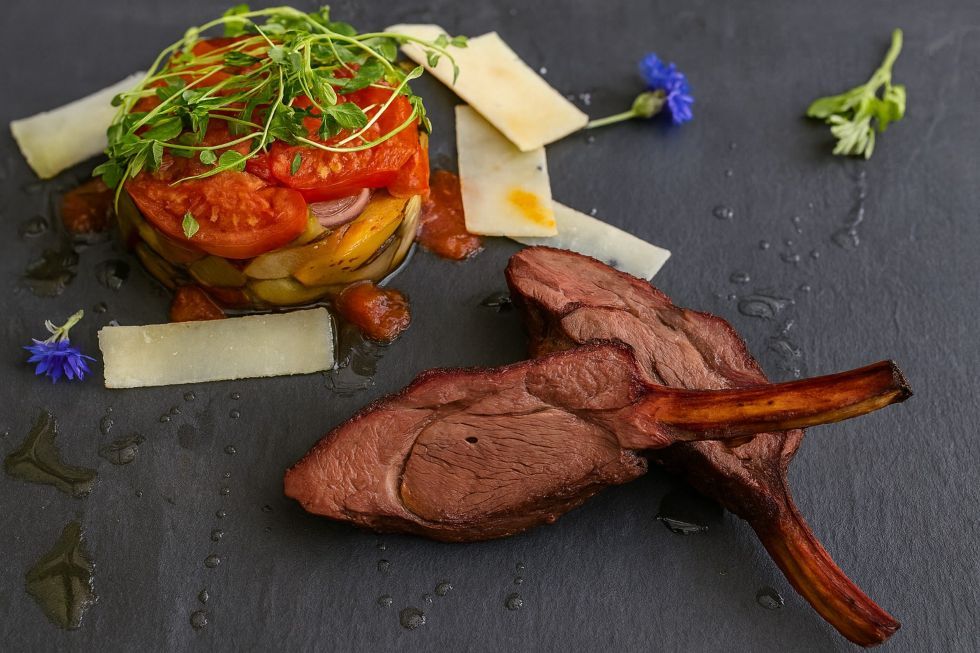 Nun setzen wir die Förmchen auf einen Teller und ziehen vorsichtig die Alufolie weg und nehmen den Servierring ab. Das Ganze garnieren wir mit fein gehobeltem Parmesan, Kräutern und den übrigen 2 EL Olivenöl. Nun können wir das Fleisch aufschneiden, neben dem Ratatouille platzieren und sofort servieren.