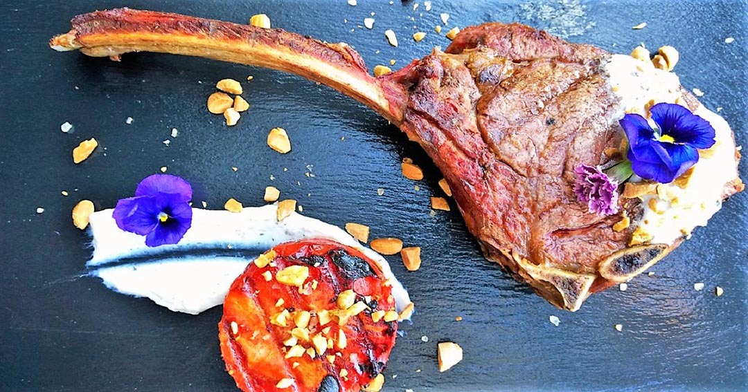 Kalbs ,,Tomahawk‘‘ mit gegrillter Wassermelone, Ziegenkäsecreme und gehackten Salzmandeln