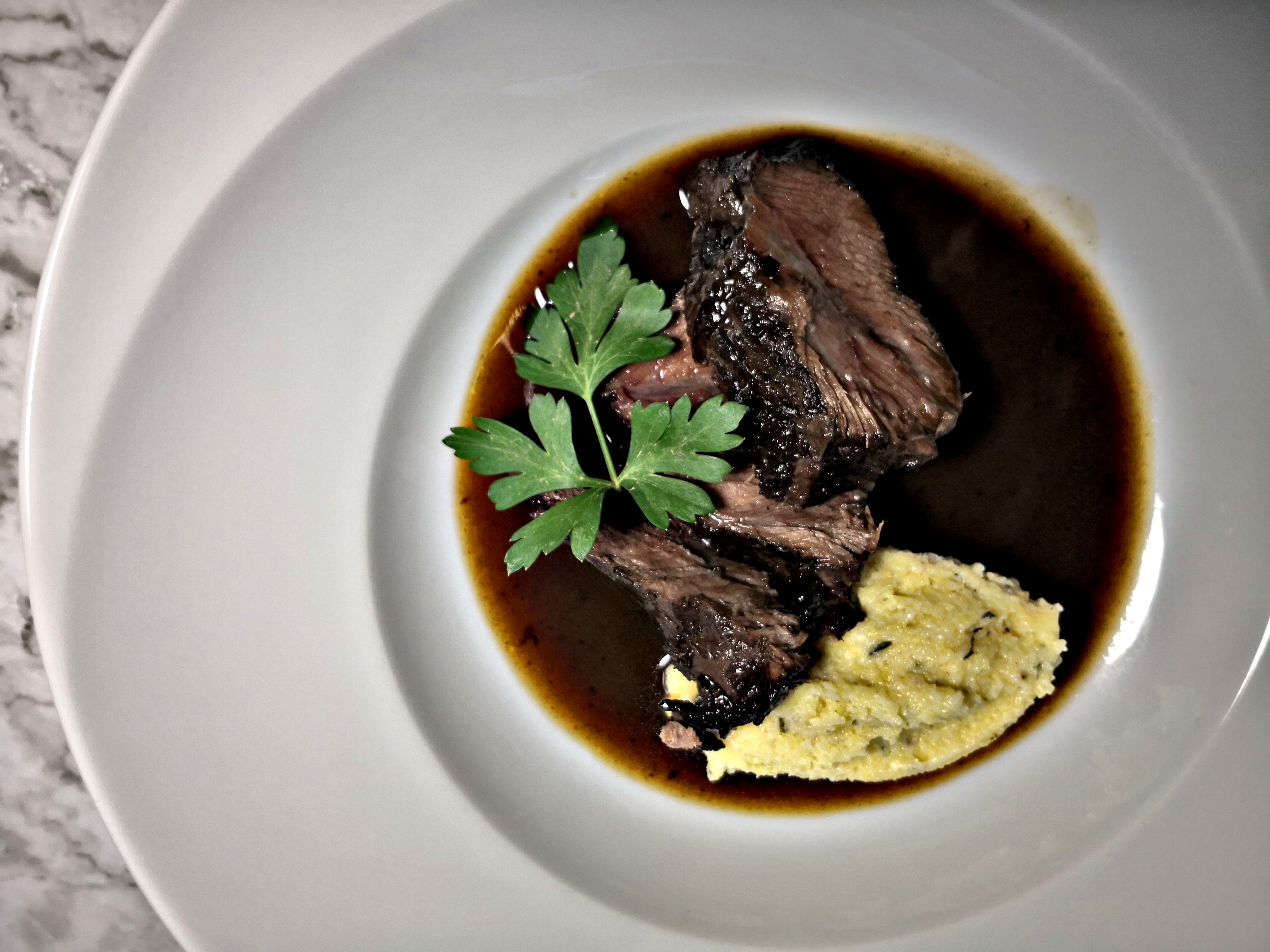 Die Kalbsbäckchen aufschneiden und mit Polenta und Sauce servieren.