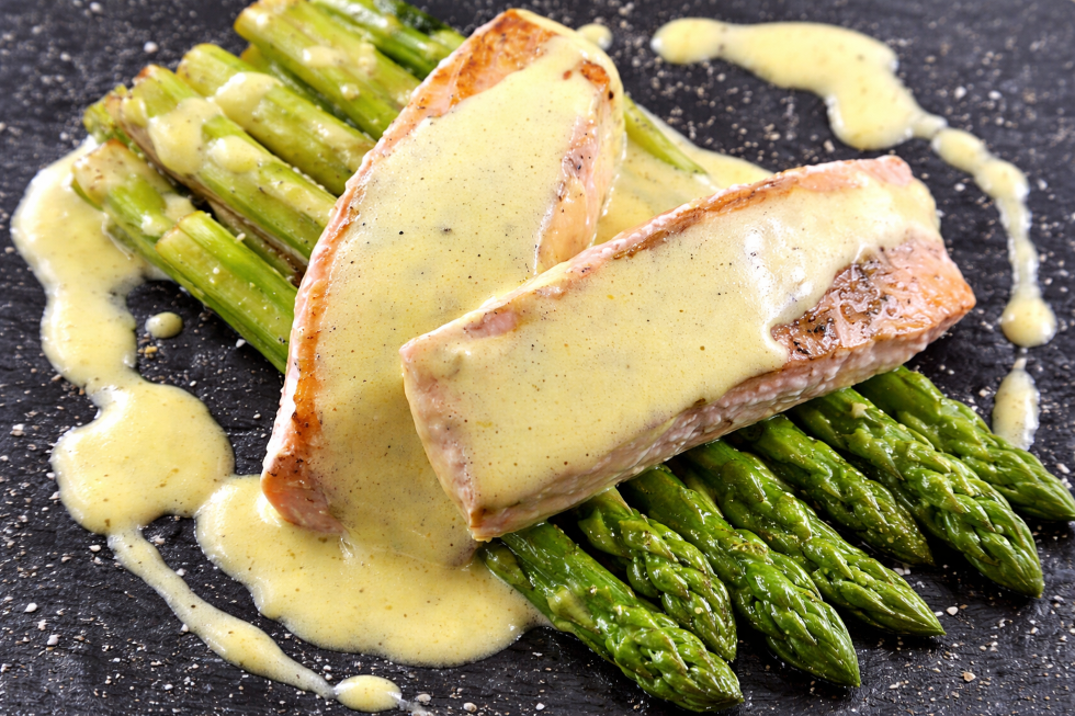 Spargel putzen, der Länge nach halbieren. Lachsfilets mit Salz, Pfeffer und Zitronensaft würzen. In einer beschichteten Pfanne 2-3 EL ÖL erhitzen und den Lachs darin auf der Hautseite ca. 5 Minuten braten. Aus der Pfanne nehmen und mit der Hautseite nach oben im Ofen in 7-8 Minuten gar ziehen. Spargel im restlichen Öl in der Pfanne anbraten, mit Salz, Pfeffer und Zucker abschmecken. Danach den Spargel mit dem Lachs und der Hollandaise sofort servieren.