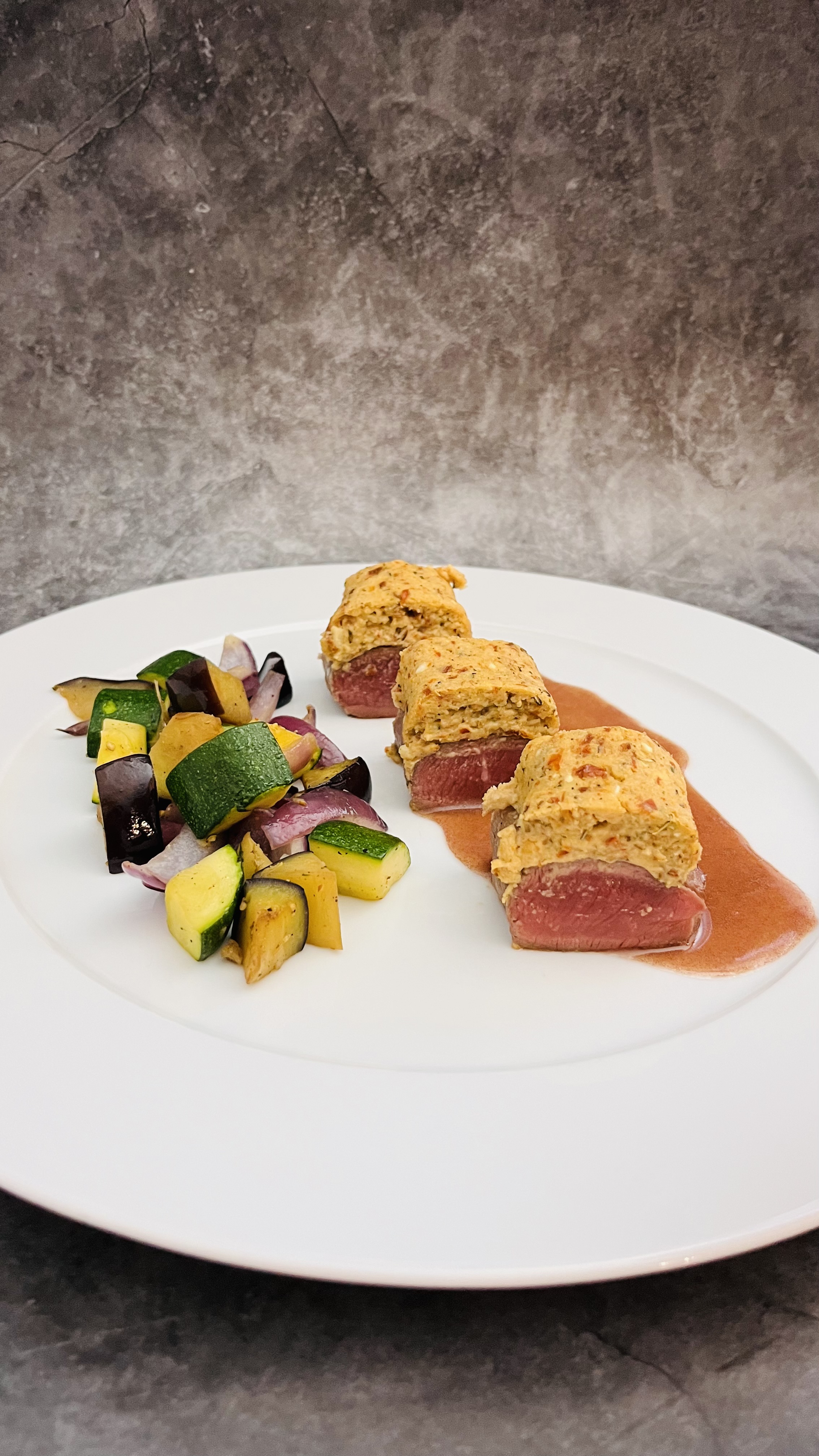 Für die Kruste getrocknete Tomaten fein würfeln. 1 Knoblauchzehe abziehern, fein hacken und mit Tomatenwürfeln, Ziegenfrischkäse, Ei, Semmelbrösel, Kräuter der Provence sowie dem geriebenen Käse verkneten. Die Masse mit etwas Salz und Pfeffer abschmecken und kalt stellen.