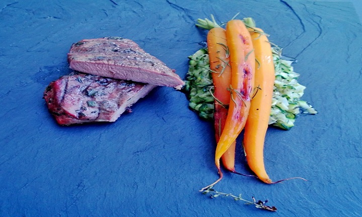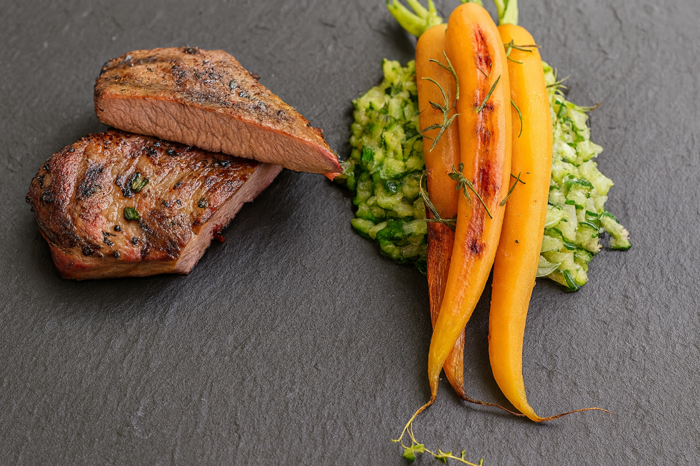 Die karamellisierten Karotten auf dem Zucchinipüree anrichten. Den Lammrücken aufschneiden, salzen und pfeffern und z..B. auf einer Schieferplatte präsentieren und nach Belieben mit etwas Rosmarin garnieren.