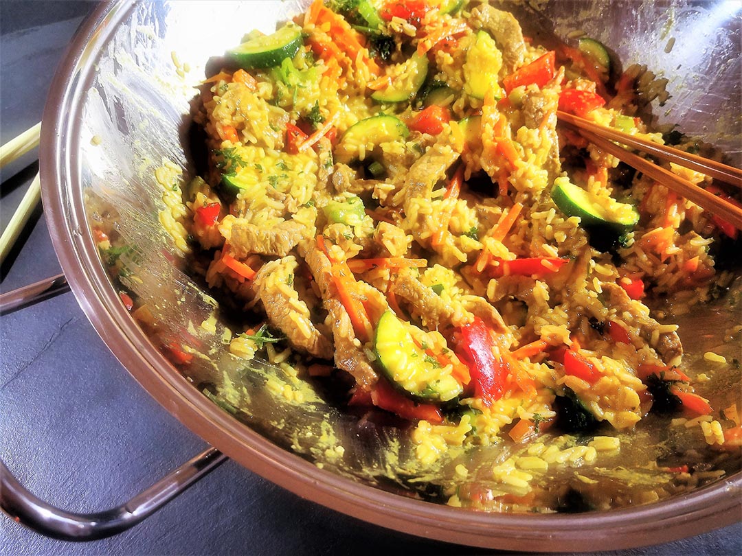 Das Öl in einem Wok erhitzen, Knoblauch, Zitronengras und Limettenblätter dazugeben und 1-2 Minuten anbraten. Das Gemüse hinzugeben und bei mittlerer Hitze unter Rühren 5-7 Minuten braten, bis es bissfest ist. Das Gemüse mit einer Schaumkelle herausheben und beiseite stellen und das Fleisch 4-6 Minuten im Wok kräftig anbraten. Dann das Fleisch mit dem Currypulver würzen. Das Gemüse wieder in den Wok geben. Den am Vortag gegarten Reis dazugeben und untermischen.