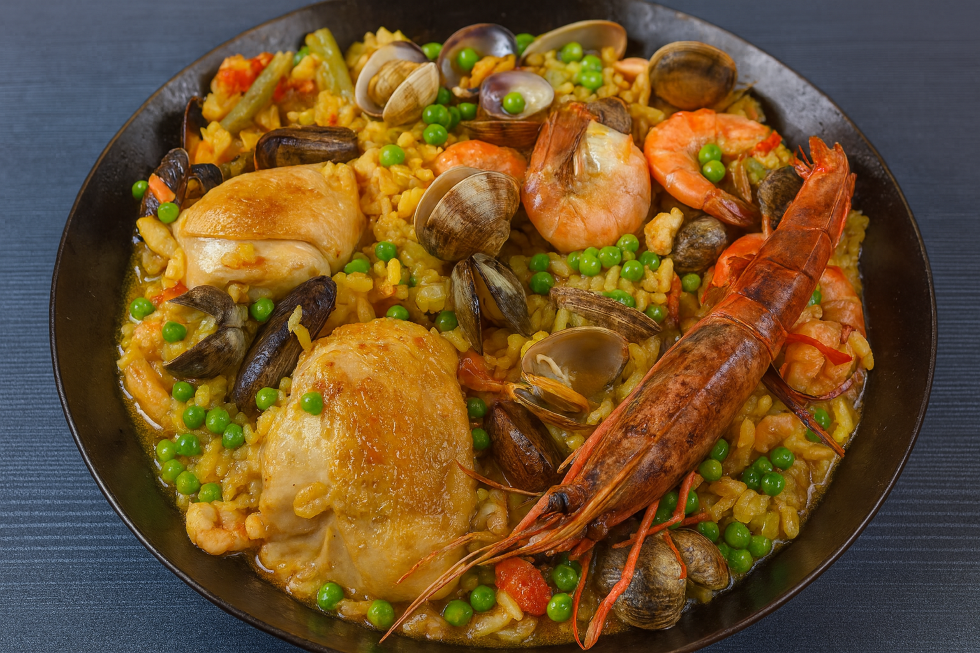 Das Olivenöl in einer Paella Pfanne oder einer großen ofenfesten Pfanne erhitzen. Die Zwiebeln mit dem Knoblauch darin glasig andünsten. Die Hähnchenteile hinzufügen und rundherum anbraten.· Das Gemüse, bis auf die Erbsen, in die Pfanne geben und 5 Minuten mitbraten. Den Reis hinzufügen und unter Rühren glasig braten. Alles mit Salz, Pfeffer und Paprikapulver würzen.