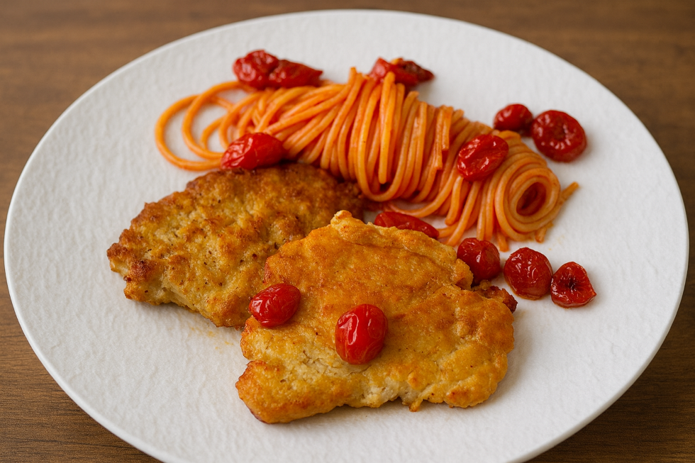 Die Eier auf einem Teller verquirlen. Semmelbrösel, Parmesan, Zitronenschale und Rosmarin mischen. Die Schnitzel zuerst durch das Ei ziehen, abtropfen lassen, dann auf beiden Seiten in der Semmelbrösel Mischung wenden. Schnitzel portionsweise im heißen Butterschmalz auf jeder Seite in ca. 3 Minuten goldbraun braten. Mit der warm gehaltenen Tomatensoße anrichten und nach Wunsch mit etwas frittierten Salbei garnieren.