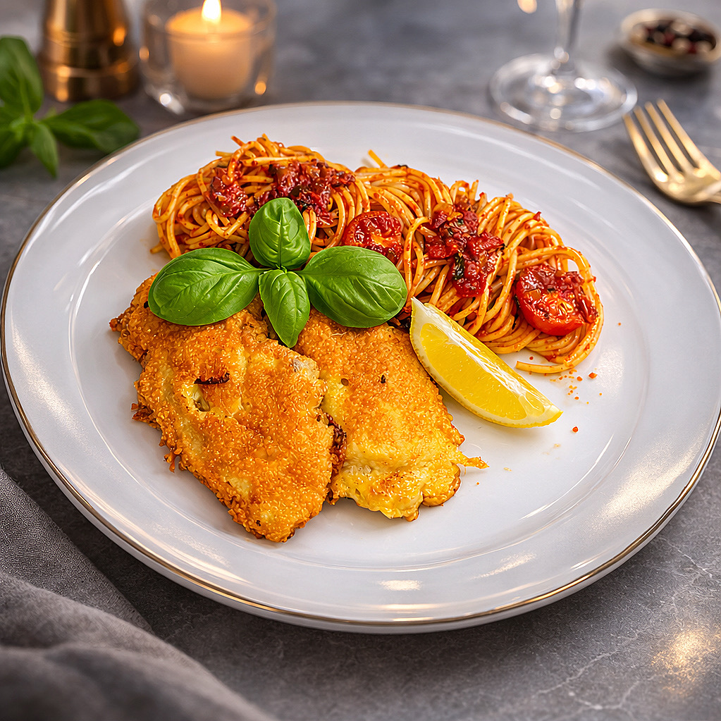 Die Spaghetti in reichlich gesalzenem Wasser ,, al dente '' kochen und abschütten. Die tropfnassen Nudeln direkt in die Tomatensauce geben. Spaghetti mit Schnitzeln, etwas Zitrone und Basilikum auf Tellern anrichten.