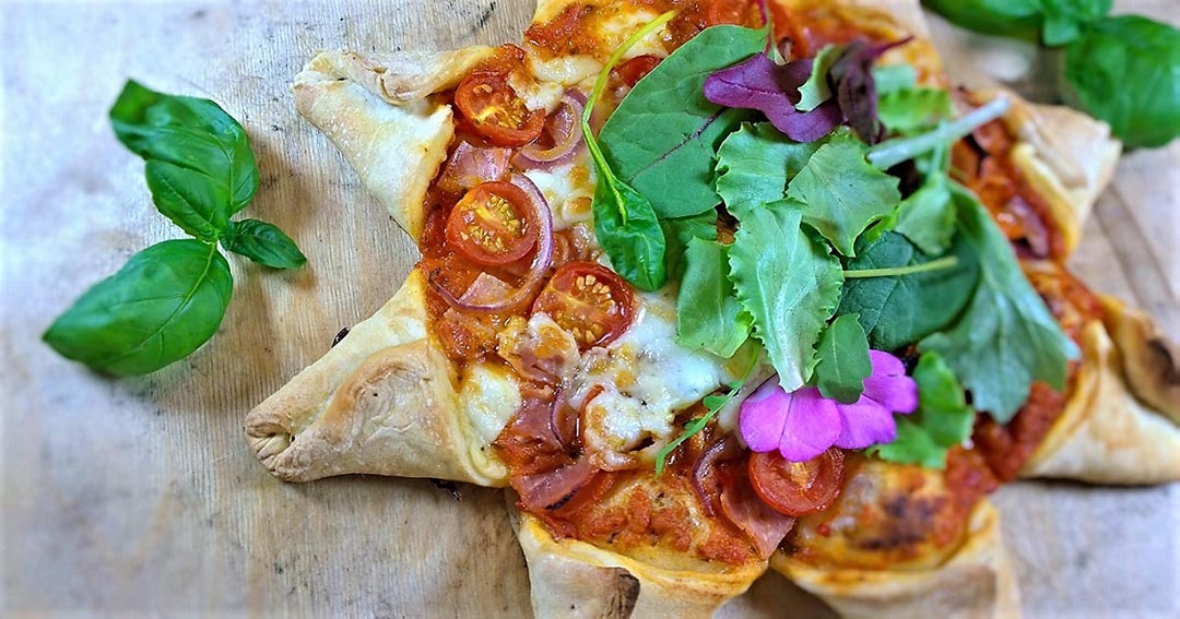 Den Teig gleichmäßig achtmal von außen zur Mitte hin jeweils ca. 8 cm weit einschneiden. Tomatensoße auf der übrigen Fläche verstreichen. Halbierte Tomaten, Zwiebelringe, Schinken und Mozzarella-Würfel darüber verteilen. Die Ecken der Teigstreifen nach innen falten, sodass ein Stern entsteht.