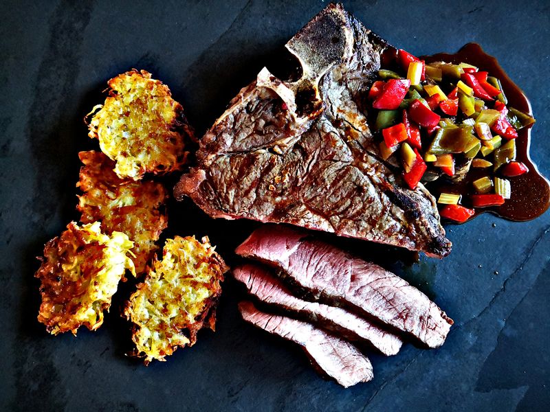 Die Steaks etwa 30 Minuten vor dem Grillen aus der Kühlung nehmen und etwas salzen. Steaks von beiden Seiten jeweils 1 Minute in der Infrarotzone grillen, danach in der indirekten Zone auf eine Kerntemperatur von etwa 54°C garen und kurz ruhen lassen. Die Steaks mit Gemüse-Jus und Kartoffel-Rösti servieren.
