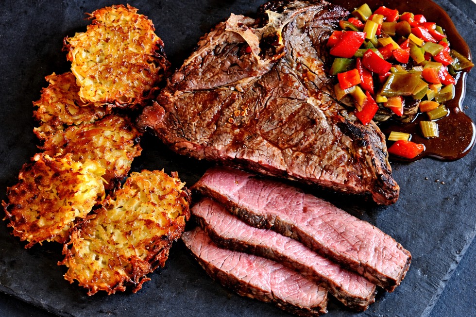 Porterhouse-Steak mit Rösti und Gemüse-Portwein-Jus