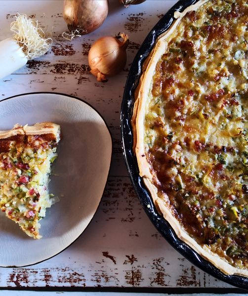 Den Backofen auf MItte, Umluft 200° C vorheizen, die Tarteform mit Butter fetten. Den Teig aus der Folie nehmen und auf einer bemehlten Arbeitsfläche dünn ausrollen. In die Form legen und einen ca. 5 cm hohen Rand formen, den Boden mehrmals mit einer Gabel einstechen. Die Hälfte der Speck-Zwiebel-Lauch Mischung auf dem Teigboden verteilen, darauf die Hälte des Le Gruyere streuen. Das Ganze nochmals mit der zweiten Hälfte wiederholen. Die Sahne-Ei-Mischung rühren und über die Speck-Zwiebel-Lauch Mischung gießen. Die Temperatur des Ofens nun auf 180°C reduzieren und die Quiche in ca. 45 Minuten goldgelb backen. Sollte sie zu schnell braun werden, eventuell gegen Ende der Backzeit mit einem Bogen Backpapier abdecken. Den Speckkuchen leicht abkühlen lassen, denn dann lässt er sich besser anschneiden.