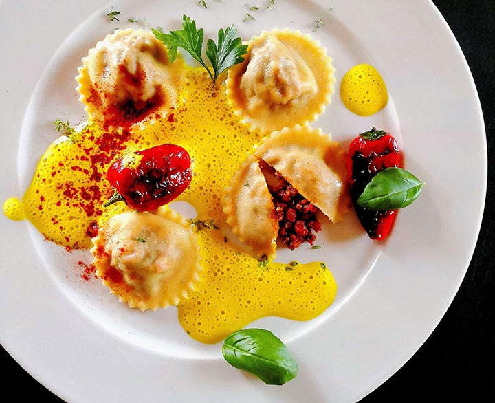 Ravioli mit der Schaumkelle aus dem Salzwasser heben, etwas abtropfen lassen und auf vorgewärmten Tellern verteilen. Die gebratenen Paprika dazulegen und die Sauce über die Ravioli träufeln.