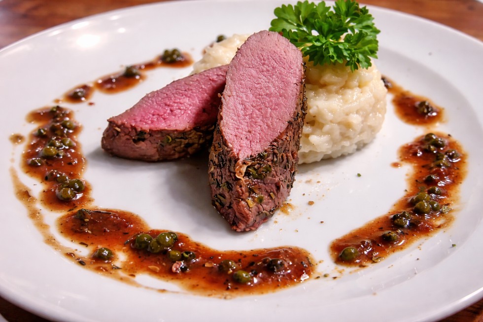 Das Rehrückenfilet schräg in Scheiben aufschneiden und mit dem Champagner-Risotto und der Pfeffersauce auf vorgewärmten Tellern anrichten und servieren.