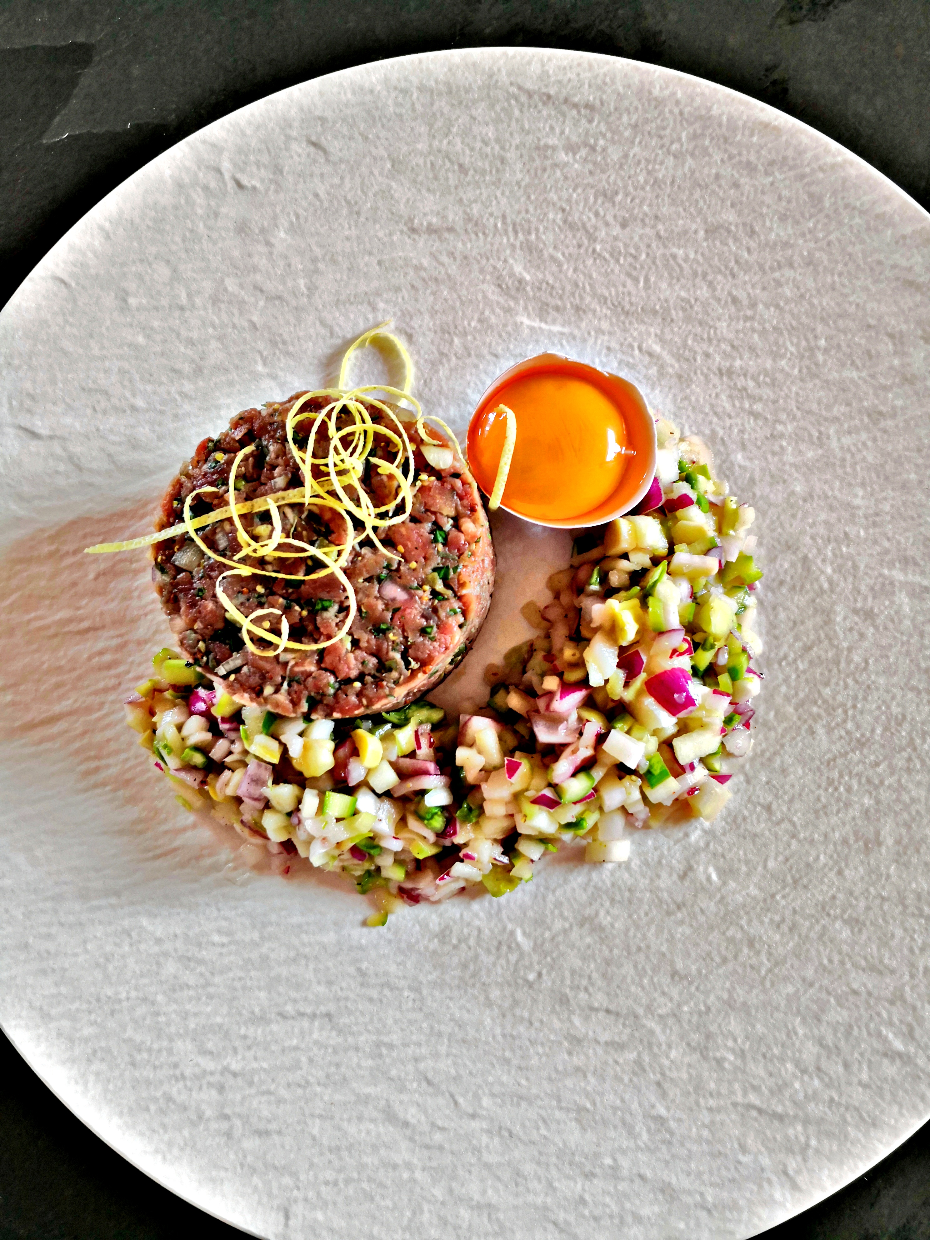 Einen Dessertring mit einem Durchmesser von etwa 8 cm an der Innenseite leicht einölen, je ein Viertel des Rindertartars hineingeben, glatt streichen und den Ring abziehen. Das Ganze noch mit Zitronenzesten und mit je einem Eigelb in der Eierschalenhälfte garnieren und abschließend mit etwas Olivenöl beträufeln.