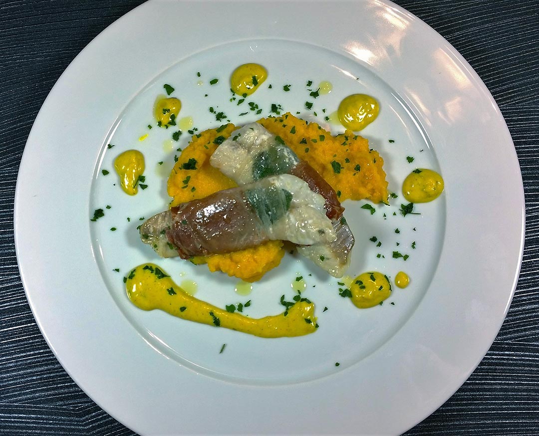 Das Rotbarschfilet abbrausen, trocken tupfen und in 8 Scheiben schneiden. Jedes Fischstück mit einem Salbeiblatt belegen und mit einer Scheibe Serrano Schinken umwickeln. Nun etwas Olivenöl bei mittlerer Hitze in einer Pfanne heiß werden lassen und die Fisch-Saltimbocca darin auf jeder Seite 2-3 Minuten garen.