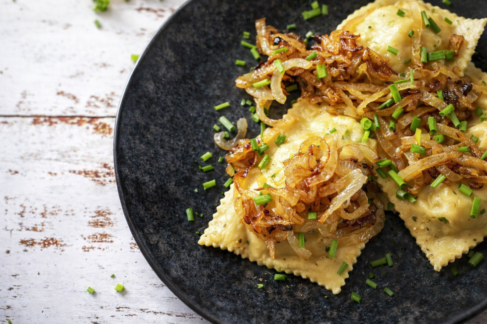 In der Zwischenzeit die Zwiebeln schälen, in Ringe schneiden und in der Butter goldbraun braten. Danach die Maultaschen mit einer Schaumkelle aus dem Fond heben, auf Tellern mit den geschmelzten Zwiebeln anrichten und mit Schnittlauch garnieren.