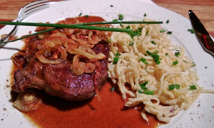 Den Rostbraten mit den Röstzwiebeln und den Spätzle auf vorgewärmten Tellern anrichten, und mit der Sauce und dem Schnittlauch sofort servieren.