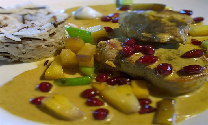 Die Granatapfelkerne, die Frühlingszwiebelringe und die Mango- und Ananasstücke in einer Pfanne im Olivenöl kurz anbraten. Das Fleisch aus der Sauce nehmen und auf vorgewärmte Teller verteilen. Den Wildreis in Servierringen neben den Filets platzieren.