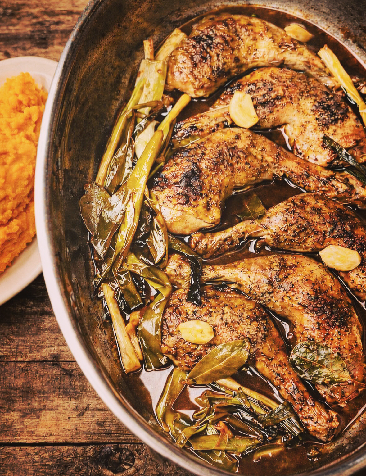 Lauchzwiebeln putzen, waschen, evtl. kleiner schneiden. Lauchzwiebeln und die Keulen in die Brühe legen, im vorgeheizten Backofen ca. 40 Minuten offen schmoren lassen. Inzwischen Süßkartoffeln und Kartoffeln schälen, waschen, in Stücke schneiden und in Salzwasser weich garen. Kartoffeln abgießen durch eine Kartoffelpresse drücken, Butter und Limettensaft unterheben und mit Salz und Pfeffer würzig abschmecken.