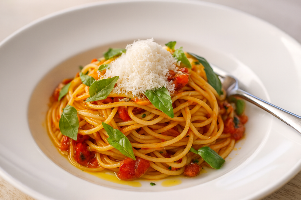 Nudelwasser abgießen, die heißen Nudeln und die gezupften Basilikumblättchen zum Tomaten-Sugo geben. Alles gut vermischen und die Pasta auf vier Tellern verteilen und mit dem übrigen Olivenöl (4 Löffel) beträufeln. Den frisch geriebenen Hartkäse drüberstreuen und sofort servieren.
