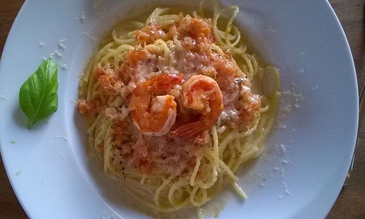 Die Nudeln in reichlich kochendem Salzwasser bissfest (al dente) garen, abgießen, abtropfen lassen und als Nester auf 4 ofenfeste Teller verteilen. Etwas von dem Garnelen-Tomaten-Mix auf die Nudeln geben und mit der Weißweinsauce übergießen. Parmesan darüber reiben und im Ofen ca. 5-7 Minuten überbacken.